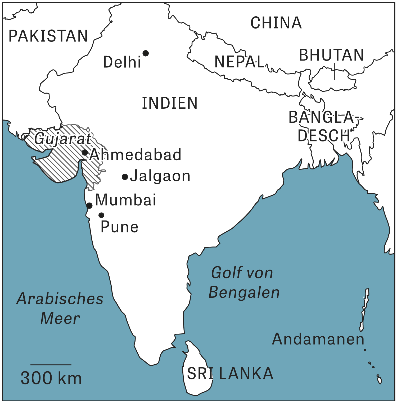 Ein Tag im Oktober 2023 in Ahmedabad, der größten Stadt von Gujarat. Neben einem träge vor sich hin fließenden Fluss, nicht weit vom Narendra Modi Stadium, dem mit 132.000 Plätzen größten Kricketstadion der Welt, liegt der berühmte Sabarmati-Aschram. Auf dem weitläufigen Gelände dämpfen Tamarindenbäume die Hitze und den Lärm der Straße. Zwischen flachen Gebäuden eine Bronzestatue: Mahatma Gandhi. Die Stadt, in der der Aufstieg des radikalen Hindus Modi zur Macht begann, war in den 1920ern Gandhis Heimat. Hier im Aschram lebte er damals mit seiner Frau, hier organisierte er den zivilen Widerstand seiner Landsleute gegen die Kolonialherren, von hier aus brach er auf zu seinem Salzmarsch.